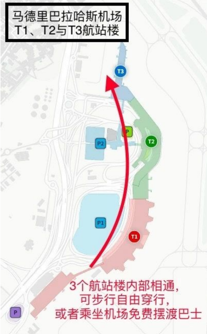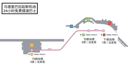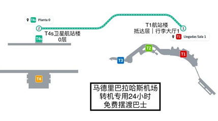 (2)T1和T4互转:入境西班牙后在航站楼外部出发层乘坐机场免费摆渡车,耗时20分钟左右。示意图请点击此处查看。