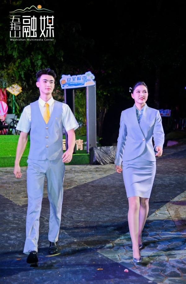 海南航空受五指山市委、市政府邀请,积极组织我司飞行员、安全员、乘务员、地面服务人员共20人一同参与到“村秀”专场活动中来,她们在璀璨灯光的照耀下,身着精美黎族苗族元素服饰、海航特业制服等,通过佩戴民族特色饰品,或手持乡镇特产,在欢呼与掌声中婉婉走上小桥,以弘扬民族服饰文化为主旨,将当地特色的产业元素巧妙地融入时装秀中,为观众呈现了一场极具民族特色的服装盛宴。而身着以中国国服旗袍形状做底,领口为祥云漫天,下摆为江涯海水,以“彩云满天”为基,寓意海航大鹏鸟翱翔于云海之间,构成独具海南航空特色的东方之美的海南航空第五代制服的乘务员们,也淋漓尽致地展现出海南航空五星航空的精神风貌和国际形象。 “村秀”现场,除了图案精巧、绚丽多彩的黎锦、苗绣服饰,各乡镇村民将当地特色产业元素与民族服饰融合,通过走秀全方面展示乡镇特色。水满乡的茶叶、毛道乡的火龙果、畅好乡的雨林百花蜜、番阳镇的青瓜……一系列农副产品与民族服饰相融合的展示赢得现场观众的阵阵掌声。秀台下,五湖四海的游客与本地市民群众,观走秀、逛市集、品美食,沉浸式体验“最炫民族风”。这场“村秀”,以时装秀为纽带,激起了乡亲们的热情,唤醒了沉睡的非遗,让宁静的乡村热闹起来,更让文旅产业火了起来,演绎出乡村振兴的新方式。