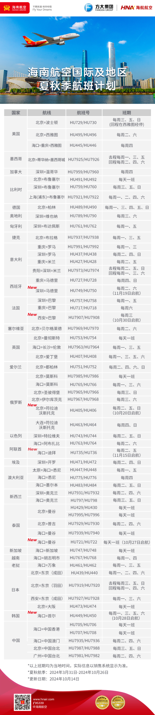 2024年10月17日,海口—本报讯:(通讯员 霍琦、张瀚兮 作者单位:海南航空控股股份有限公司)海南航空计划于2024年11月15日起新开海口—迪拜国际航线,这是海南航空继海口—阿布扎比航线后开通的第二条自海口直飞阿联酋的国际航线。作为海南航空在海口出港的第十五条国际及地区航线,海南航空海口—迪拜航线的开通,将进一步助力中阿双方携手高质量共建“一带一路”,精心打造“点多面广”“上天入地”的全方位合作格局。