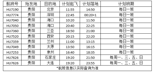 新航季,海南航空在贵阳共运营9条国内航线,航点覆盖北京、深圳、西安、海口、三亚等公商务及冬季热门旅游城市,每周计划执行出港航班67个班次。旅客可关注海南航空微信公众号或下载海南航空官方APP查询及购票。