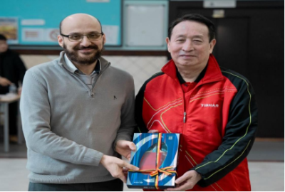 比利时前国家队主教练王大勇向学校赠送专业训练球拍