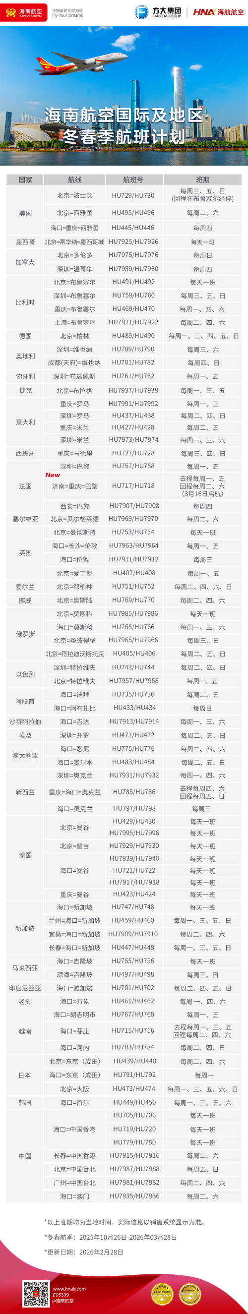 海南航空国际及地区航线航班计划