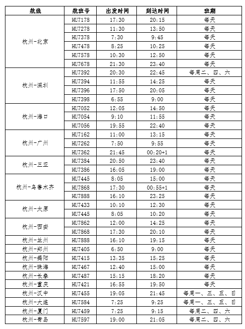 同时,海南航空加密多条杭州进出港热门航线:杭州—北京航线加密至每日6班,杭州—乌鲁木齐航线加密至每日3班,杭州—汉中航线加密至每周4班。